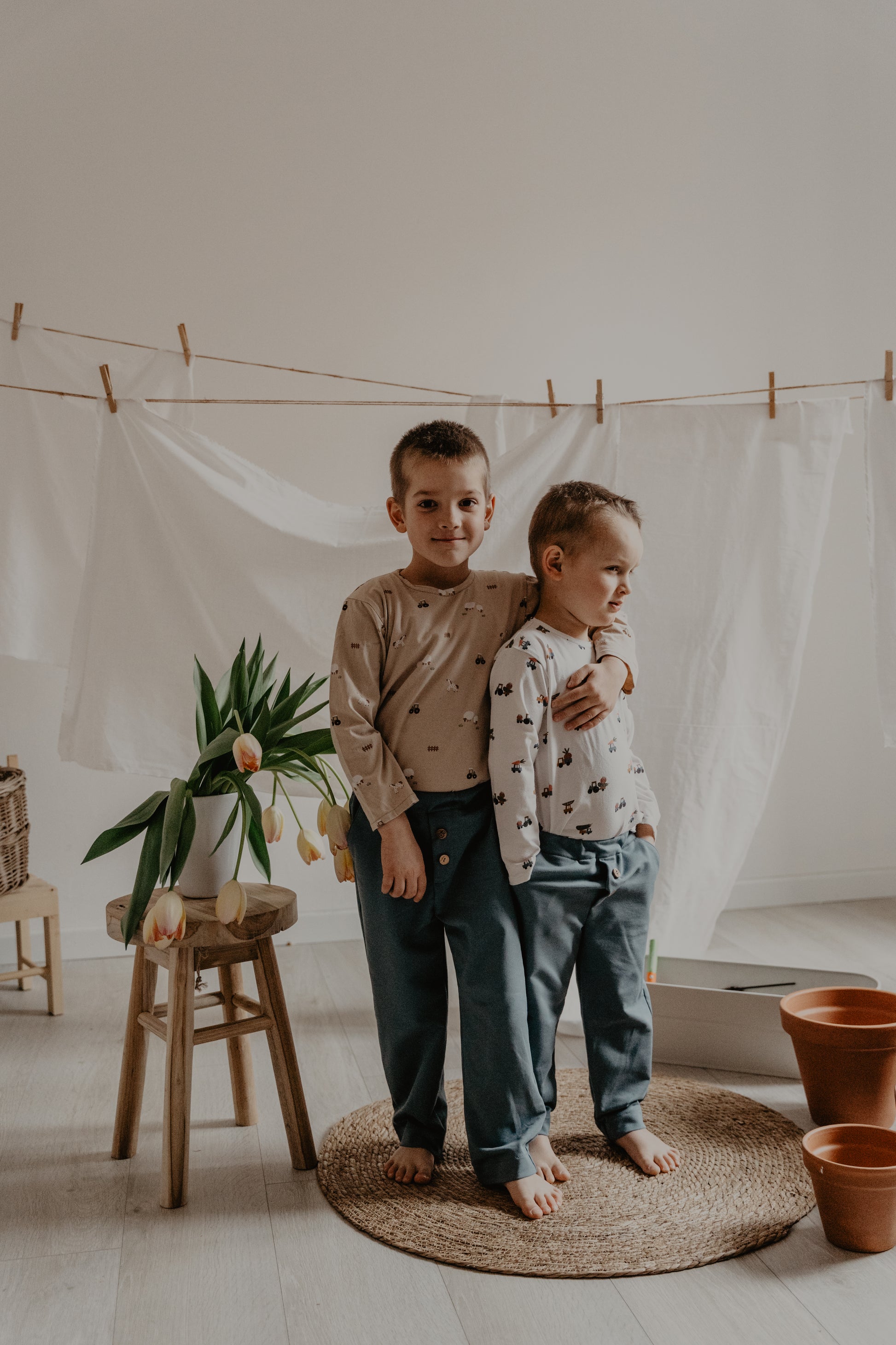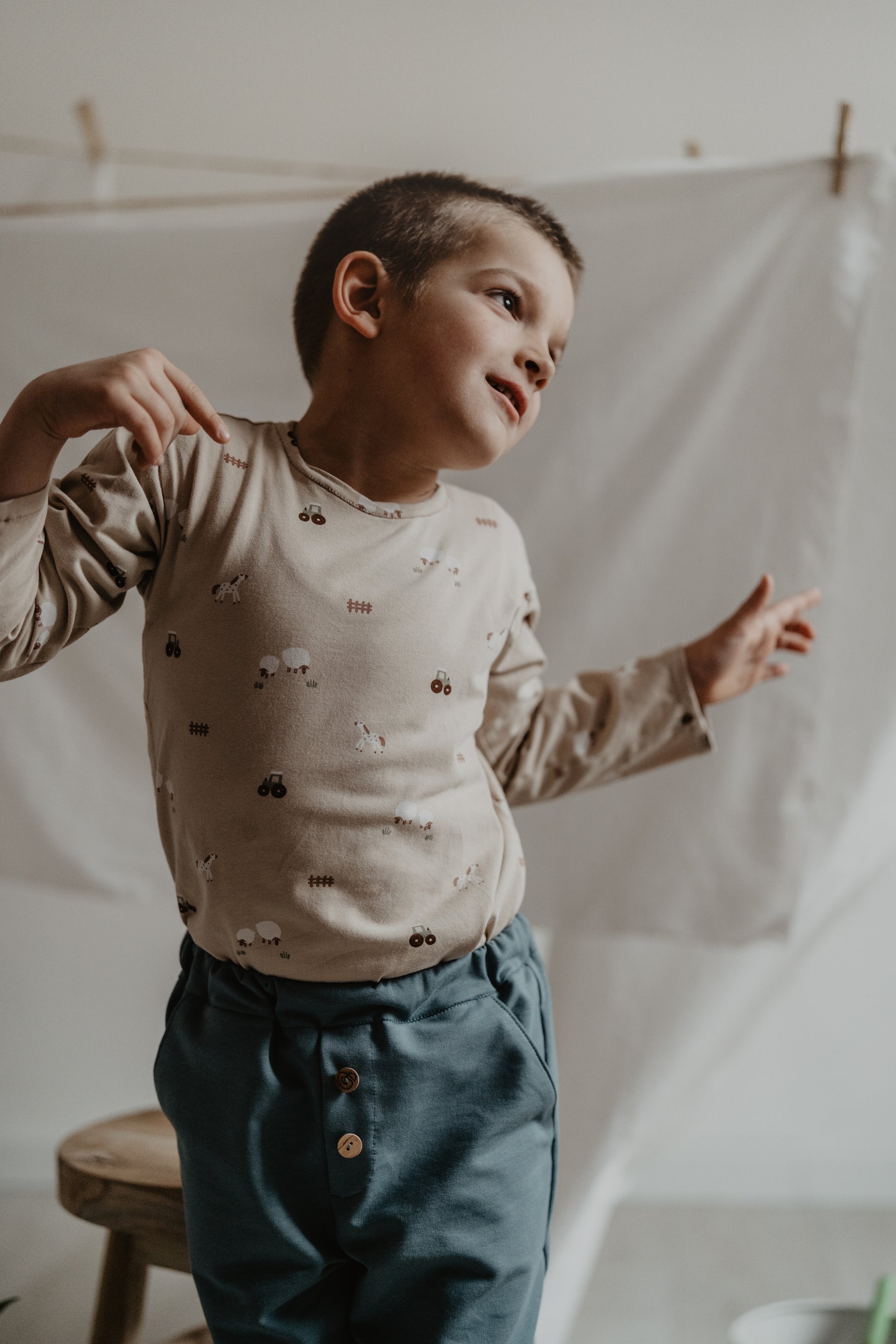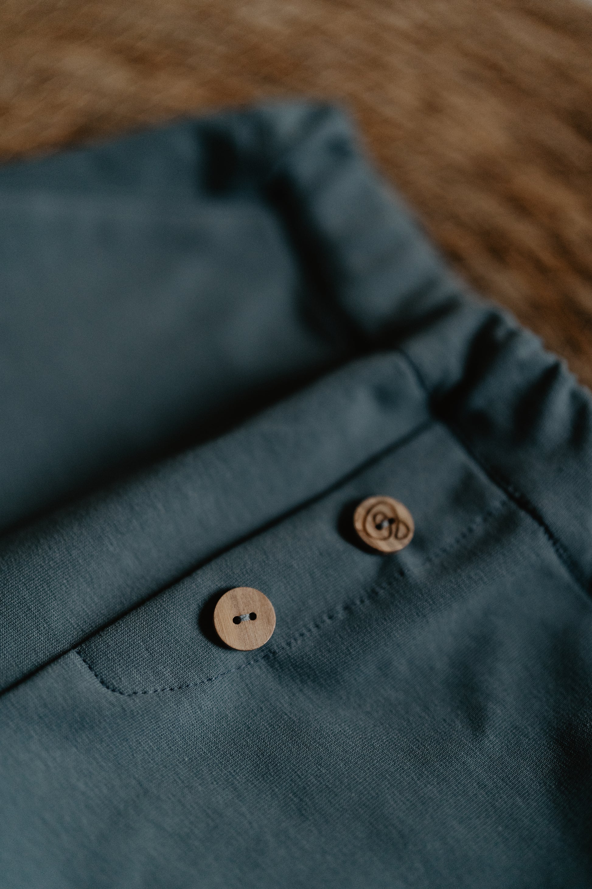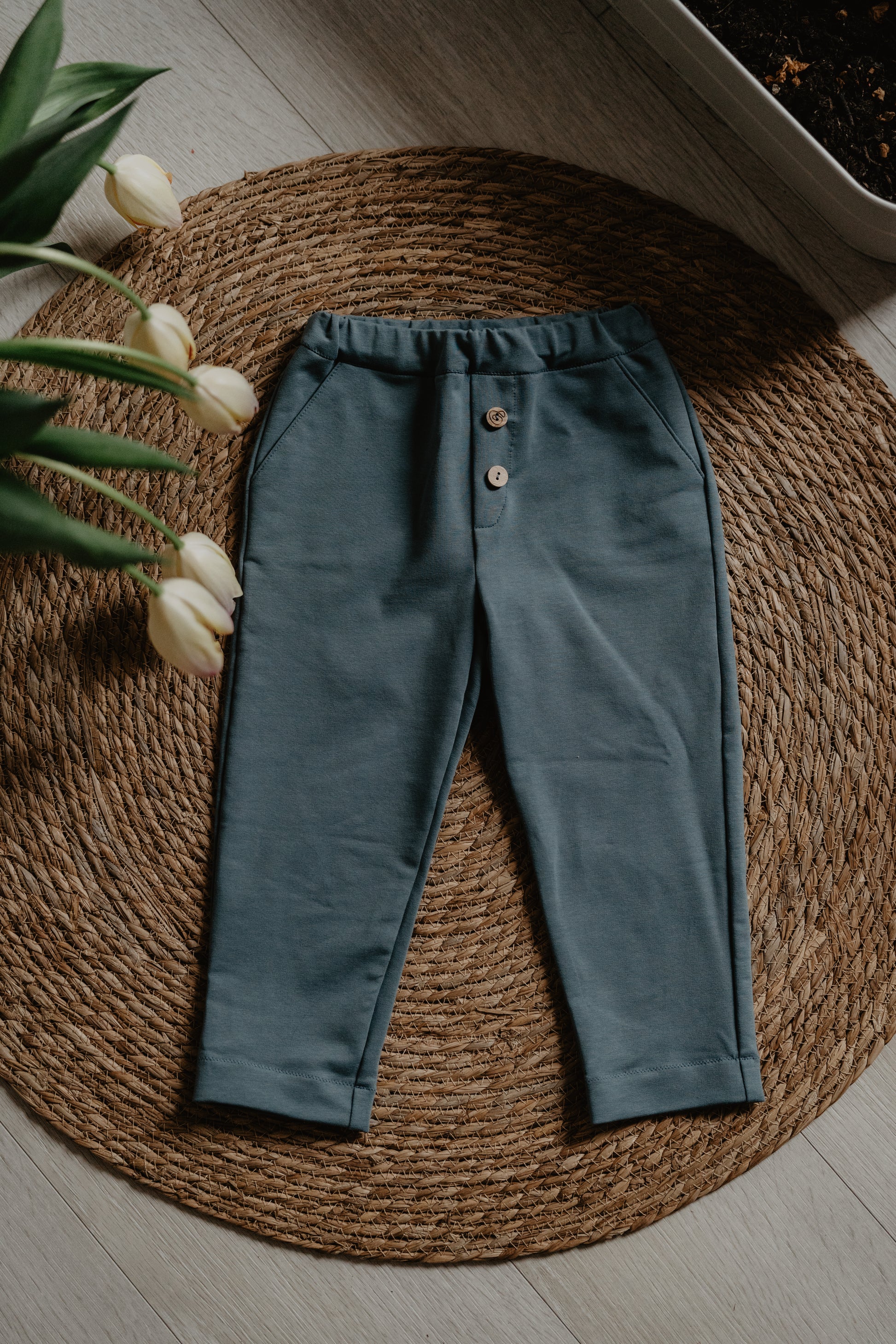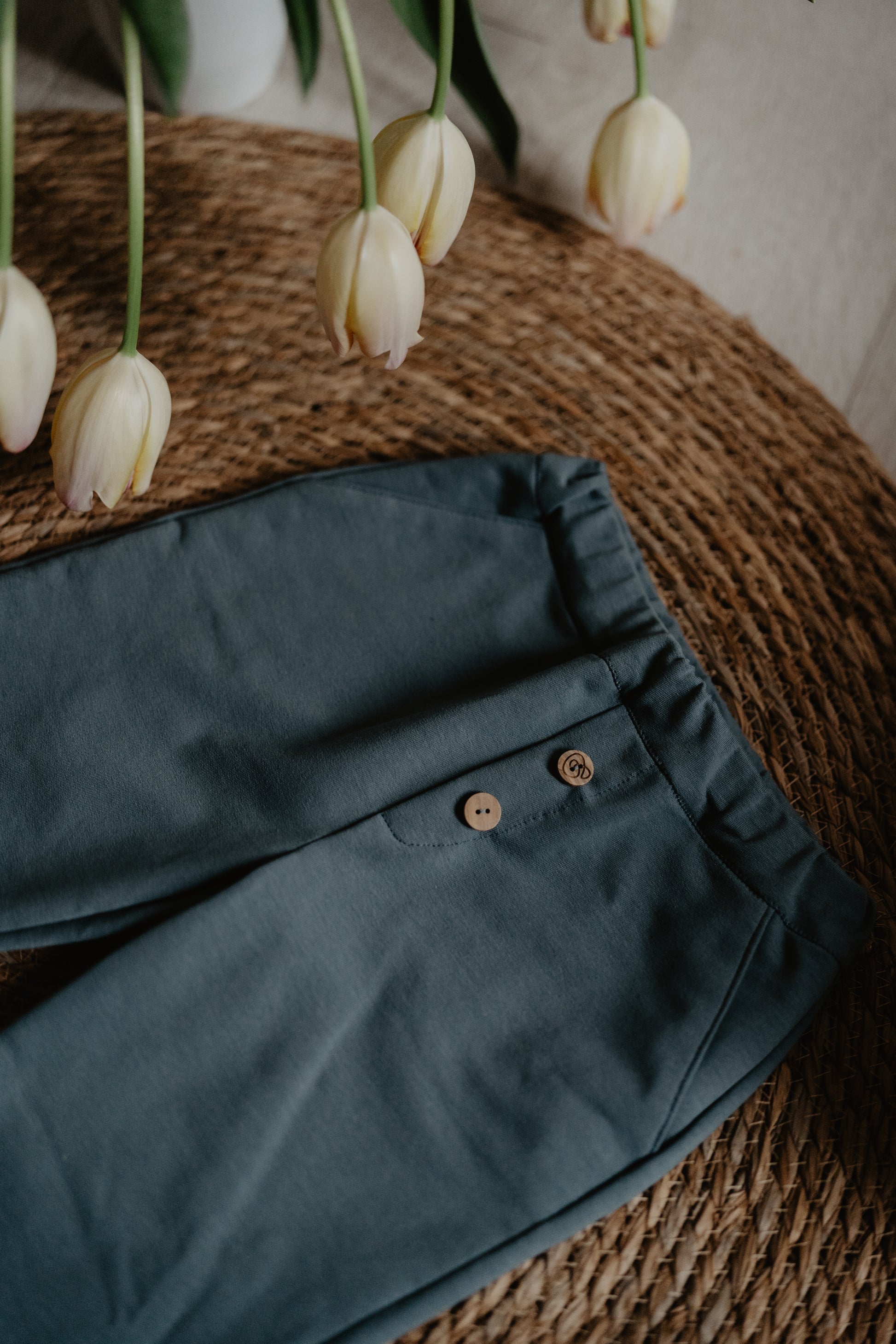 Pantalone dal taglio dritto e pratico. In Jersey di cotone garzato, l’alleato perfetto per la quotidianità . Finta abbottonatura impreziosita da due bottoncini in legno, elastico in vita e due pratiche tasche inserite.